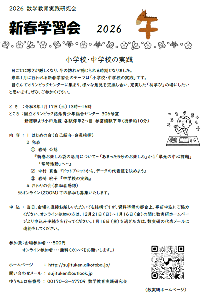 最新情報は、 数学教育実践研究会のFacebookページでお知らせしています。 Facebookにログインしていなくても閲覧可能です。